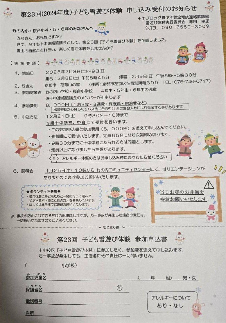 毎年、2月頃の予定(現地の予約状況により3月になる場合もあり)で、地域の二つの小学生4年~6年生の希望者を対象に、京都・「花背山の家」の施設を利用して、一泊二日で実施しています。